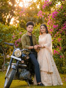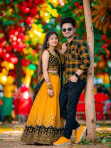 Photo of a boy with a girl, the girl’s body will be lehenga, yellow, black mix, hand bangles, earrings, girl age 16 to 17 years, height 5 feet 2 inches, photo quality 4k 8k.. the background will be abstract area, the boy will be wearing yellow, black color shirt, pant jeans black color, eye glasses dabang black round, a smart watch in hand, face matching like, white feet, yellow color shoes, Background blur,