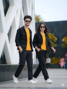 Create a realistic 4k resolution, photo of Vivek 20 years old, exact same face features, walking confidently with a stylish girl in the same location as the reference image, near the bold white geometric wall structure. Same dark background with soft greenery and clear sky, no sunlight. Both walking with attitude, synchronized steps, natural movement in hair and clothing. Outfits: yellow t-shirts, black denim jackets, black cargo pants, and white shoes. clean sunglasses, modern accessories, ultra-sharp clarity, cinematic lighting, premium high-end fashion street-style photoshoot look