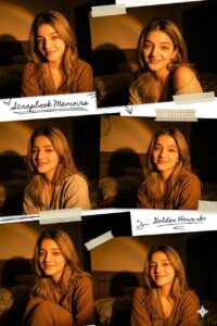 Ultra-realistic cinematic collage of a young woman using the uploaded face exactly