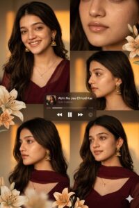 A warm-toned cinematic portrait collage of a young woman with soft glowing skin, subtle freckles, and glossy nude lips. She has long dark brown hair styled in loose waves with face-framing strands. She is wearing traditional gold jhumka earrings and a delicate necklace, dressed in a deep maroon outfit with a sheer dupatta around the neck. The lighting is golden-hour inspired with rich amber highlights and soft shadows, creating a cozy, intimate mood. The composition is a collage layout with multiple cropped frames of her face—close-ups of eyes, lips, and side profile-arranged aesthetically. Add soft floral elements like beige and orange lilies placed around the frame. Include a blurred music player overlay showing a song playing for a nostalgic vibe. Skin appears dewy and radiant, with minimal elegant makeup. Style: soft glam, editorial, aesthetic Instagram collage, warm color grading, high detail, shallow depth of field, cinematic lighting, 4K, ultra-realistic.