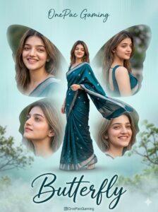 Create a high-resolution, cinematic butterfly-themed collage poster of a young South Indian woman. Name : OnePac Gaming Use the uploaded image as the exact face reference (strict face preservation – 100% identical facial features, skin tone, hairstyle, expression, no changes at all). The design should feature: A large central full-body image of the woman wearing a traditional saree (deep teal/blue tone with silver border), standing gracefully and slightly twirling the Surrounding her, include 4 smaller portrait shots (close-up angles, smiling, side poses) arranged symmetrically in a butterfly wing shape. Add soft feathered edges around the smaller images to blend into the background. Background: Soft pastel teal/blue gradient background with subtle vertical texture lines. Light mist/fog effect at the bottom. Slight nature touch (blurred trees or greenery in background for depth). Styling: Elegant, dreamy, and feminine aesthetic. Soft natural lighting with smooth skin tones. Add subtle glow and depth of field. Typography: Add a stylish cursive title text at the bottom: “Butterfly” Add a name at the top in elegant handwritten font. Include a small Instagram-style username below. Quality: Ultra HD, 4K resolution Sharp focus, professional photo manipulation Poster design, studio-quality finish–ar 3:4 –v 6 –style raw Create a high-resolution, cinematic butterfly-themed collage poster of a young South Indian woman. Use the uploaded image as the exact face reference (strict face preservation – 100% identical facial features, skin tone, hairstyle, expression, no changes at all). The design should feature: A large central full-body image of the woman wearing a traditional saree (deep teal/blue tone with silver border), standing gracefully and slightly twirling the Surrounding her, include 4 smaller portrait shots (close-up angles, smiling, side poses) arranged symmetrically in a butterfly wing shape. Add soft feathered edges around the smaller images to blend into the background. Background: Soft pastel teal/blue gradient background with subtle vertical texture lines. Light mist/fog effect at the bottom. Slight nature touch (blurred trees or greenery in background for depth). Styling: Elegant, dreamy, and feminine aesthetic. Soft natural lighting with smooth skin tones. Add subtle glow and depth of field. Typography: Add a stylish cursive title text at the bottom: “Butterfly” Add a name at the top in elegant handwritten font. Include a small Instagram-style username below. Quality: Ultra HD, 4K resolution Sharp focus, professional photo manipulation Poster design, studio-quality finish–ar 3:4 –v 6 –style raw